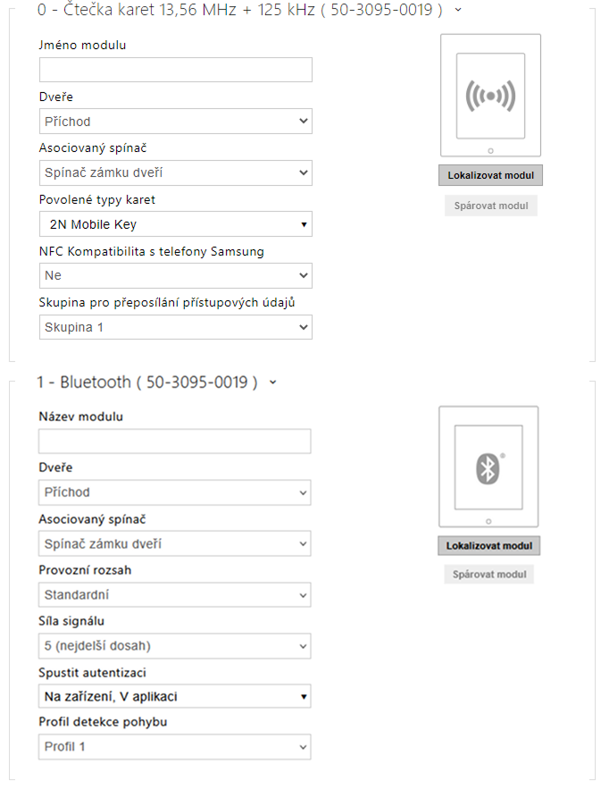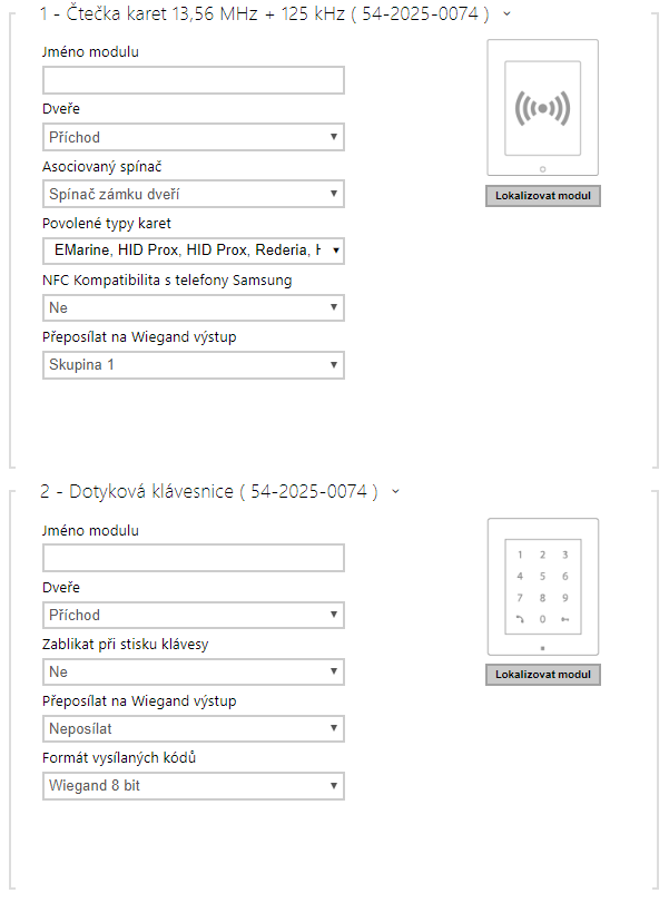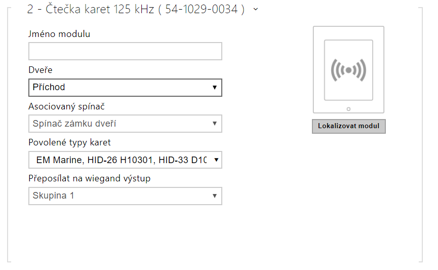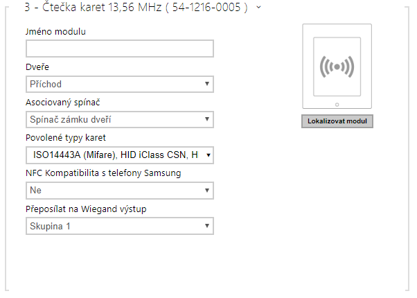 - Pro rychlejší čtení přístupových karet doporučujeme vybrat v nastavení daného modulu pouze typy karet, které jsou používány uživatelem.
