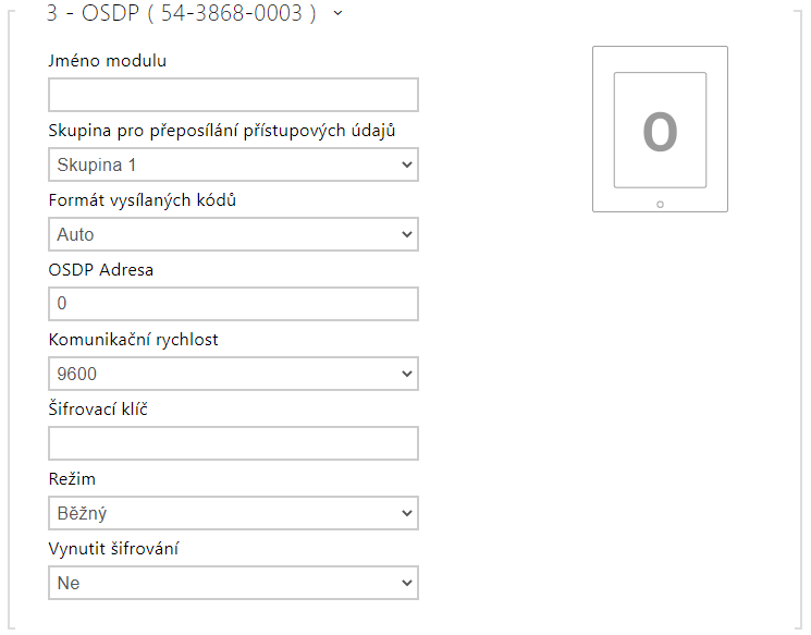 - OSDP Adresa – adresa OSDP modulu v rozmezí 0–126 na OSDP lince.