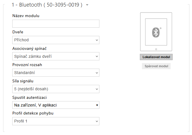 - Síla signálu – nastavuje dosah signálu (hodnota 5 reprezentuje nejdelší dosah, hodnota 1 nejkratší), tj. vzdálenost, na kterou ještě bude Bluetooth modul komunikovat s mobilním telefonem. Při nastavení je doporučeno vyzkoušet reálný dosah signálu, který je ovlivněn řadou faktorů (zejména prostorovým rozvržením instalace, použitým mobilním telefonem a jeho pozicí).