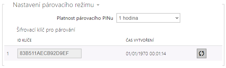 V režimu párování se z bezpečnostních důvodů se pro zabezpečení komunikace používá jiný klíč než při komunikaci po spárování. Tento klíč je automaticky vygenerován při prvním spuštění zařízení a lze jej kdykoli přegenerovat.