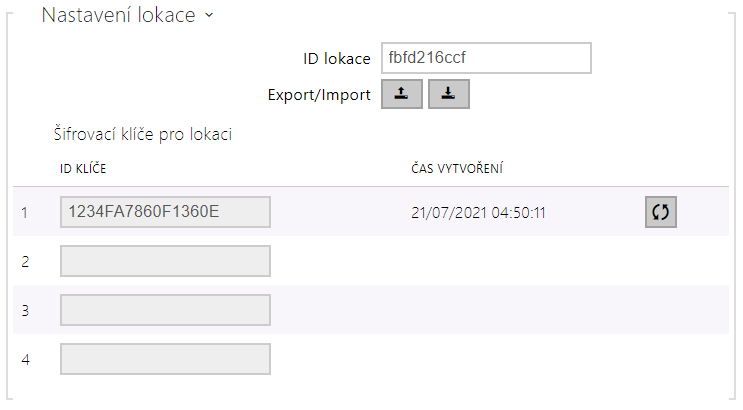- Tlačítko Import – importuje ID lokace a aktuální šifrovací klíče ze souboru exportovaného z jiného zařízení.
