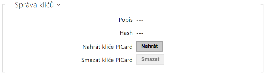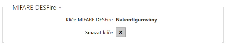 - Klíče MIFARE DESFire – indikuje stav konfigurace pro čtení MIFARE DESFire karet. Pokud některý z parametrů potřebných pro čtení MIFARE DESFire v konfiguraci chybí nebo je neplatný, je stav Nekonfigurovány. Pokud jsou přítomny všechny parametry a jsou platné, je stav Konfigurovány.
