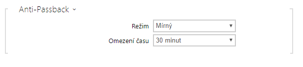 - Režim – volí režim funkce Anti-Passback: