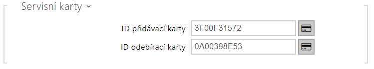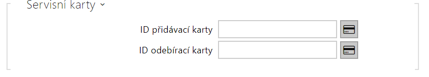 - ID přidávací karty – ID servisní karty určené pro přidávání do seznamu instalovaných karet. ID karty je sekvence 6–32 znaků z množiny 0–9, A–F.