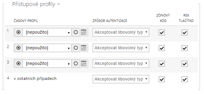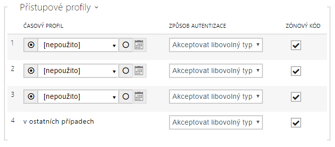- Zónový kód – povoluje zónový kód pro kombinaci časového profilu a způsobu autentizace v tomto řádku. Zónový kód je pak možno použít místo PIN kódu uživatele.