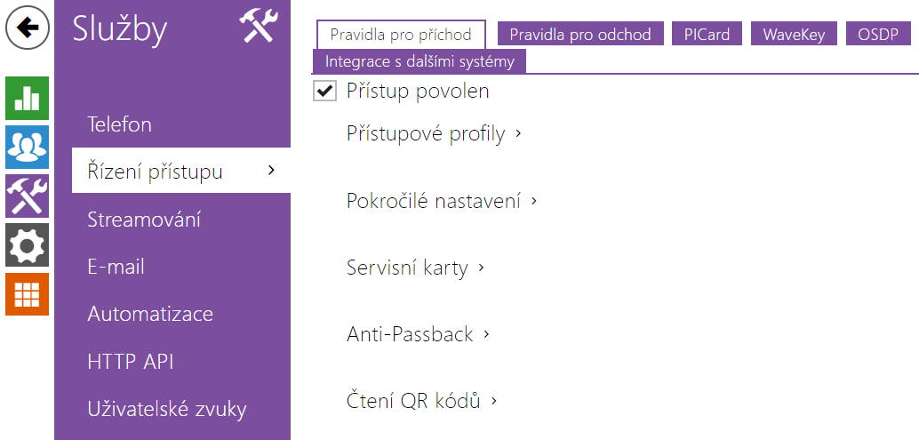 - Přístup povolen – povoluje jakýkoliv přístup z konkrétní strany dveří (příchod, odchod). Pokud není přístup povolen, není možno dveře z této strany otevřít.
