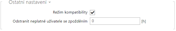 - Odstranit neplatné uživatele se zpožděním – nastavuje zpoždění, po kterém jsou uživatelé s neplatným přístupem a povoleným automatickým odstraněním odstraněni z adresáře zařízení.