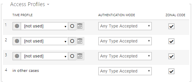 - Zonal Code – enable the zonal code for the time profile and authentication combination in this row. You can use the zonal code instead of the user PIN.