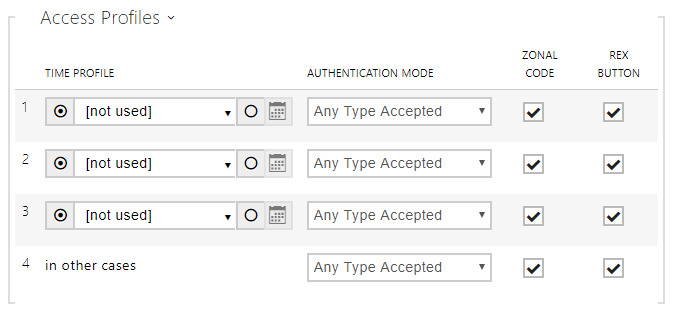 - Authentication Mode – set the authentication mode for the time profile in this row including multiple authentication for enhanced security. Select Access denied to ban access.