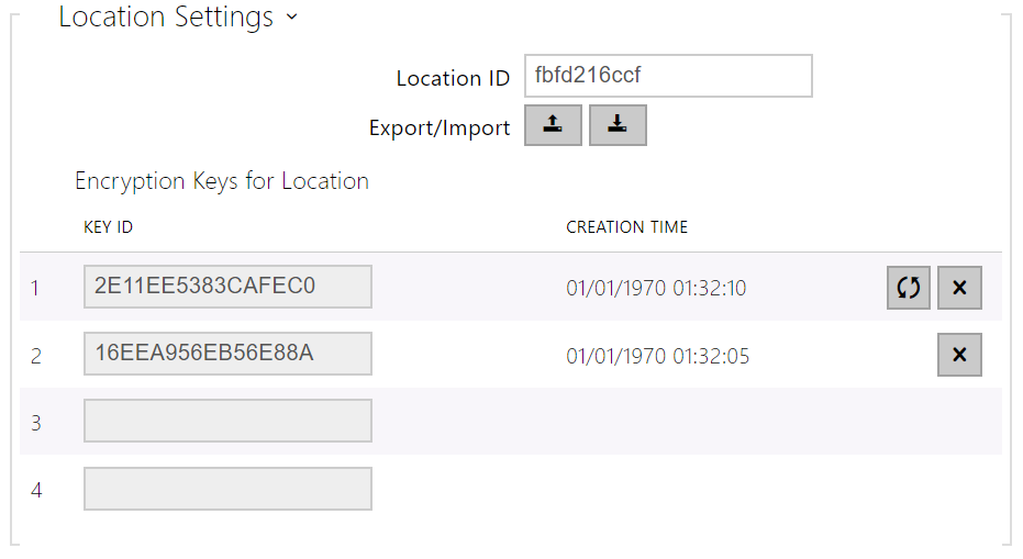 - Export – push the button to export the location ID and current encryption keys into a file. Subsequently, the exported file can be imported to another device.