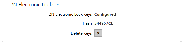 - 2N Electronic Lock Keys – indicates the state of the configuration for Electronic Lock keys reading. If any of the Electronic Lock reading parameters is missing or invalid in the configuration, the state is Not configured. If all the parameters are present and valid, the state is Configured.