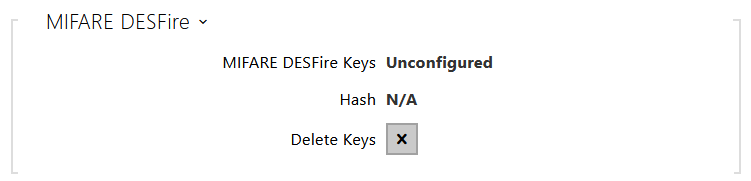 - MIFARE DESFire Keys – indicates the state of the configuration for MIFARE DESFire cards reading. If any of the MIFARE DESFire reading parameters is missing or invalid in the configuration, the state is Not configured. If all the parameters are present and valid, the state is Configured.