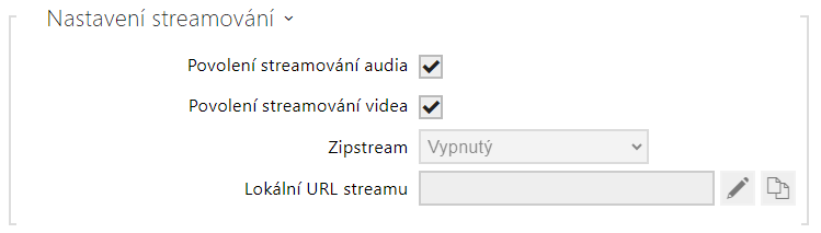 - Zipstream (dostupné pouze pro H.264) – nastavení zipstreamu lokálního URL streamu, které má přednost před hodnotou zadanou v Nastavení Streamování.