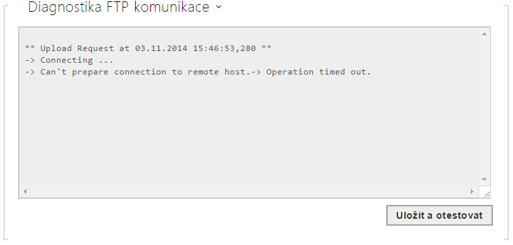 Po stisku tlačítka Uložit a otestovat dojde k uložení aktuálně nastavené konfigurace FTP serveru, sejmutí obrázku z kamery a jeho uložení na FTP server. V průběhu ukládání obrázku se v okně výše zobrazuje detailní průběh komunikace s FTP serverem.