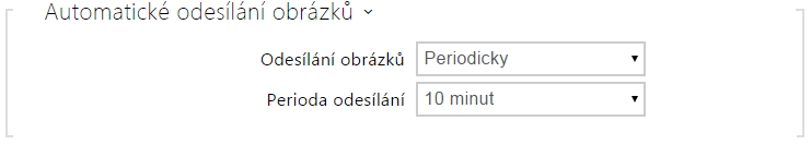 - Odesílání obrázků – umožňuje nastavit automatické odesílání obrázků na FTP server při začátku hovoru, příp. periodicky po uplynutí nastavené doby. Automatické odesílání obrázku lze vypnout (volba Automatizace), poté lze stále odesílat obrázky pomocí akce automatizace Action.UploadSnapshotToFtp.