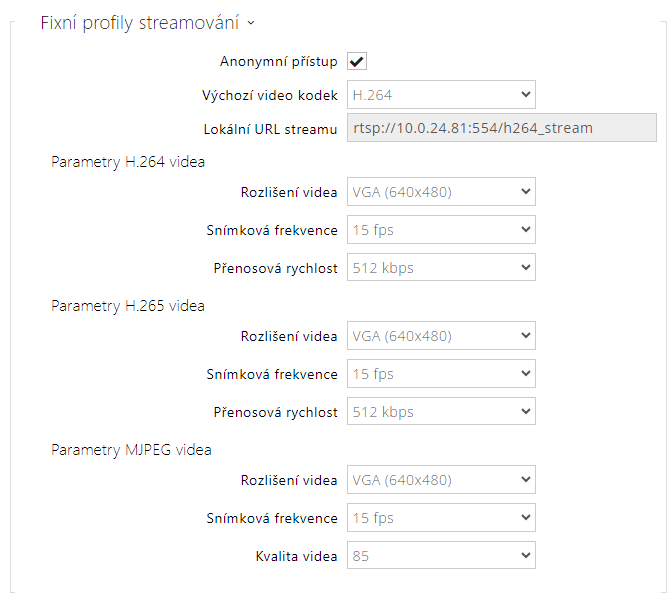 - Povolení streamování videa – povoluje nabízení video streamu při navazování spojení s RTSP serverem. Není-li streamování videa povolené, nebude se přenášet video přes fixní profily streamování ani přes lokální URL stream.