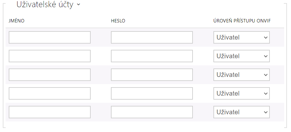 Pro správnou funkci ONVIF je nutné vytvořit alespoň jeden uživatelský účet a nastavit správnou úroveň přístupu (dle specifikace ONVIF a použité VMS). Bez nastavení uživatelských účtů jsou dostupné pouze základní funkce.