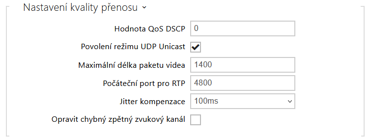 - Hodnota QoS DSCP – nastavuje prioritu audio a video RTP paketů v síti. Nastavená hodnota se odesílá v poli TOS (Type of Service) v záhlaví IP paketu.