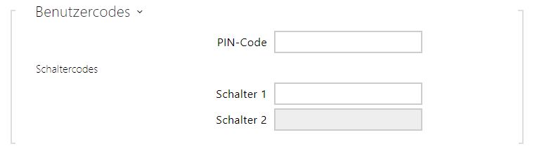 - Schalter – Ermöglicht den persönlichen Code des Nutzers für das Einschalten des Schalters einzustellen. Der Code darf bis 16 Zeichen lang sein und darf nur die Ziffern 0–9 enthalten. Der Code muss mindestens zwei Zeichen für die Türentriegelung von der Gerätetastatur und mindestens ein Zeichen für die Türentriegelung mit DTMF vom Telefon enthalten.