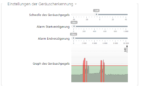 - Graph des Geräuschpegels – zeigt die Historie des gemessenen Signalniveaus an. Rot sind die Zeitpunkte markiert, in den der Alarm aktiviert ist.