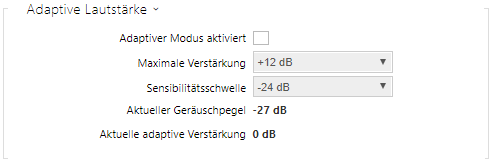 - Aktuelle adaptive Verstärkung – zeigt die aktuell angewendete Verstärkung der Gesamtlautstärke an. Der Wert ist durch die Differenz des aktuellen Schallpegels und der festgelegten Sensibilitätsschwelle bestimmt und überschreitet nie die eingestellte maximale Verstärkung.