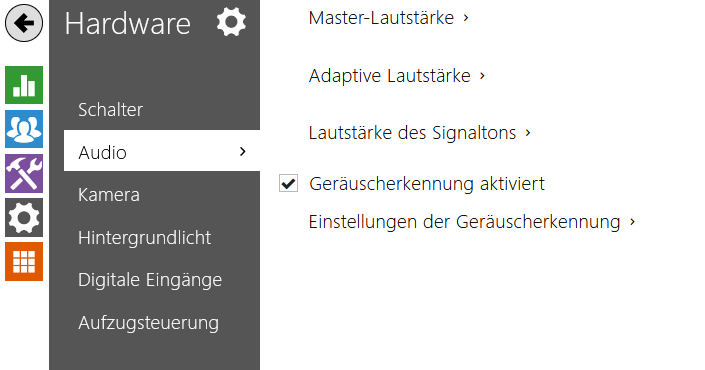 - Lautstärke Schalteraktivierung – stellen Sie die Lautstärke des Schaltton aktivieren ein. Der Wert bezieht sich auf die Gesamtlautstärke.