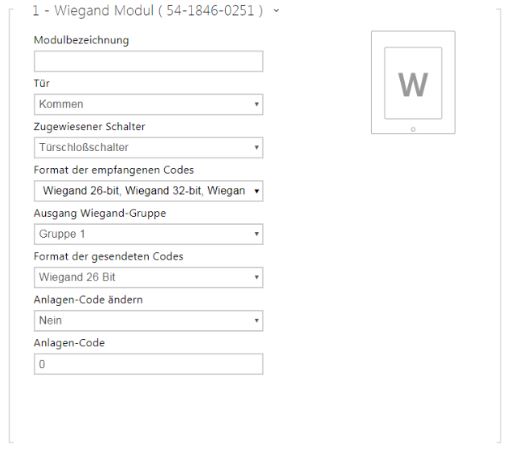 Das Wiegand-Modul ist mit einer Eingangs- und Ausgangs-Wiegand-Schnittstelle ausgestattet, die von einander unabhängig sind, unabhängige Einstellung haben und Codes gleichzeitig empfangen und senden können Man kann die Eingangs-Wiegand-Schnittstelle für den Anschluss von externen Geräten nutzen, wie RFID-Kartenleser, biometrische Scanner u.Ä. Mittels der Ausgangs-Wiegand-Schnittstelle kann man das Gerätes z.B. an das Sicherheitssystem im Gebäude anschließen (man kann die IDs der RFID-Karten, die an den angeschlossenen RFID-Leser angelegt werden, bzw. die Codes, die in einer beliebigen Eingangs-Wiegand-Schnittstelle aufgenommen wurden, absenden). Das Wiegand-Modul ist mit einem logischen Eingang und einem logischen Ausgang ausgestattet, die man mittels der Automation bedienen kann.