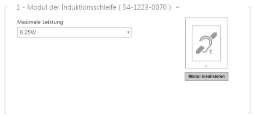 - Maximale Leistung – Stellt die maximale Sendeleistung der Antenne der Induktionschleife ein. Eine größere Sendeleistung bedeutet größere Reichweite, jedoch weniger Leistung für die anderen Gerätesfunktionen. Unter normalen Umständen sollte der voreingestellte Wert von 0,25 W ausreichend sein.