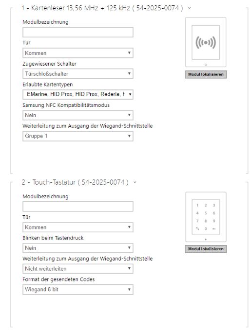 Man kann jeden der angeschlossenen Module einzeln konfigurieren. Die Parameter sind für den jeweiligen Modultyp spezifisch.