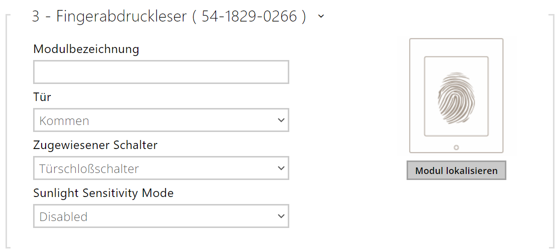 - Modulbezeichnung – Stellt den Modulnamen ein. Die Bezeichnung des Moduls wird beim Loggen der Ereignisse aus dem Fingerabdruckscanner verwendet.