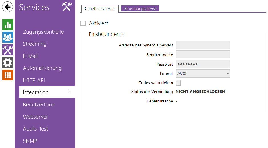 Freigegeben– erlaubt die Verbindung mit dem externen Sicherheitssystem Genetec Synergis.