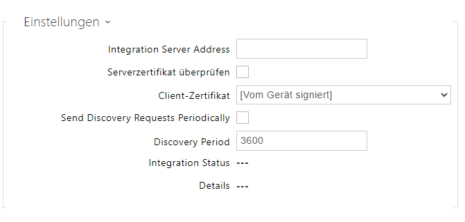 Adresse des Integrationsservers –legen Sie die URL für den Erkennungsdienst fest. Das Gerät sendet HTTP-Anfragen mit Basisinformationen beim Start, bei IP-Adressänderung und periodisch (wenn konfiguriert). Wenn das Feld leer bleibt, werden keine Anfragen gesendet.