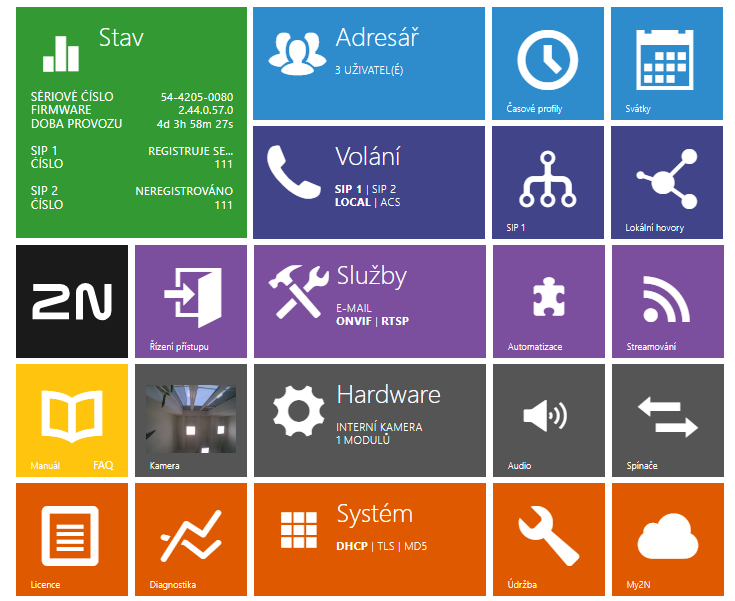 Úvodní stránka slouží jako první úroveň menu a rychlá navigace (kliknutím na libovolnou dlaždici) do vybraných částí konfigurace interkomu. V některých dlaždicích se zároveň zobrazuje stav vybraných služeb.