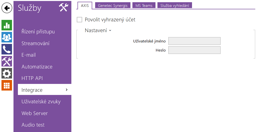 - Povolit vyhrazený účet – povoluje funkci volání na Axis Camera Station (ACS). Pro volání na ACS se použije speciální URI ve tvaru vms:*.