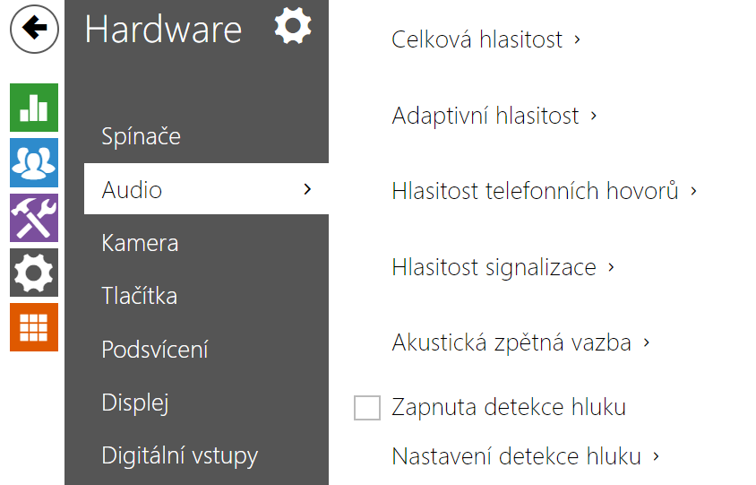 - Hlasitost signalizace sepnutí spínače – nastavuje hlasitost tónu sepnutého spínače. Hodnota je relativní k celkové hlasitosti.