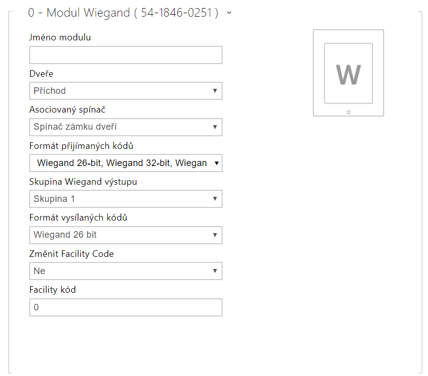 Modul Wiegand je vybaven vstupním a výstupním wiegand rozhraním, které jsou na sobě nezávislé, mají nezávislé nastavení a mohou přijímat a vysílat kódy současně. Vstupní wiegand rozhraní lze použít pro připojení externích zařízení, jako jsou čtečky RFID karet, biometrické čtečky apod. Pomocí výstupního wiegand rozhraní lze interkom připojit např. k zabezpečovacímu systému v budově (lze odesílat ID RFID karet přiložených k připojené RFID čtečce příp. kódy přijaté na libovolném vstupním wiegand rozhraní). Modul Wiegand je dále vybaven jedním logickým vstupem a jedním logickým výstupem, které lze ovládat pomocí Automation.