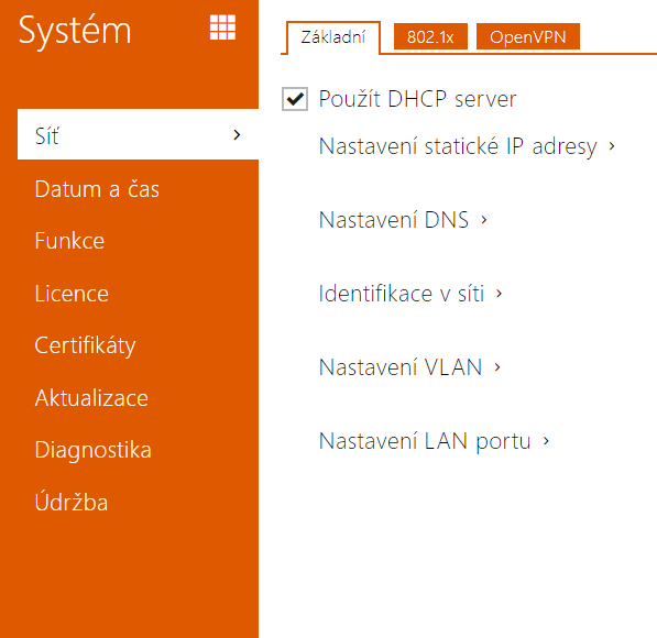 - TLS autentizace povolena – povoluje použití autentizace zařízení v síti pomocí protokolu 802.1x EAP-TLS. V případě, že vaše síť 802.1x nepodporuje, tuto funkci nezapínejte. V opačném případě se interkom stane nedostupným.