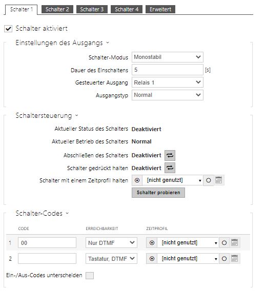 Geben Sie in der Registerkarte Hardware / Schalter / Schalter 1 den Schalter mittels des Feldes Schalter freigegeben frei, stellen sie den Parameter Gesteuerter Schalter auf den Ausgang des Interkoms ein, an den das elektrische Türschloss angeschlossen ist. Stellen Sie danach einen oder mehrere Codes für das Einschalten des Schalters – des elektrischen Türschlosses ein.