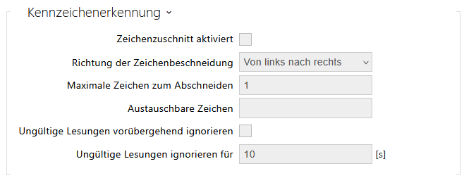 - Zeichenzuschnitt aktiviert – Wählen Sie, ob das Zuschneiden erkannter Kennzeichen erlaubt ist.