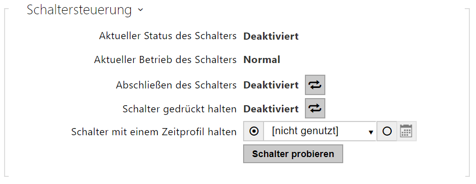 - Die Taste „Schalter probieren“ – ermöglicht es manuell die Funktion des Schalters zu aktivieren, zum Beispiel des elektrischen Schlosses oder einer anderen angeschlossenen Anlage.