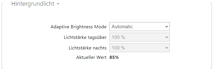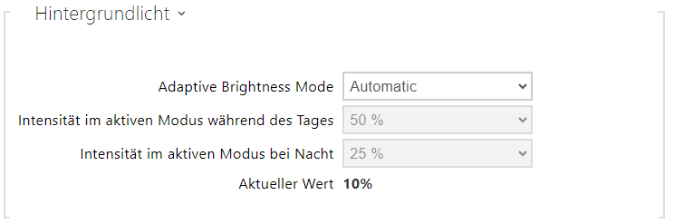 - Aktueller Wert – zeigt den aktuell automatisch ausgewählten Wert der Hintergrundbeleuchtungsintensität entsprechend der aktuell erfassten Umgebungslichtstärke an.