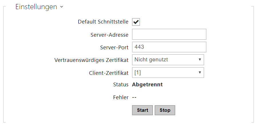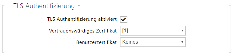 - TLS Authentifizierung aktiviert – erlaubt die Anwendung der Anlagenauthentifizierung im Netz mittels des Protokolls 802.1x EAP-TLS. Aktivieren Sie diese Funktion nicht, wenn Ihr Netz nicht 802.1x unterstützt. Im anderen Fall wird Ihr Interkom unerreichbar.