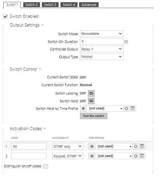 Enable the switch in the Switch Enabled parameter in the Hardware / Switches / Switch 1 tab, set the Controlled Output to the intercom output to which the electric door lock is connected. Now set one or more activation codes for the electric door lock switching.