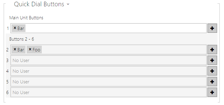 In the Hardware / Buttons menu is displayed the list of all potentially available intercom buttons The list is including those that are physically absent. In some intercom models (2N IP Vario, 2N IP Verso), the button list is divided into 8/ 5-item groups corresponding to the button extending modules. Click , select the user and press Add to add a user to the editing field. To search a user in the list, use the fulltext field and the username. One quick dial button can be shared by multiple users.