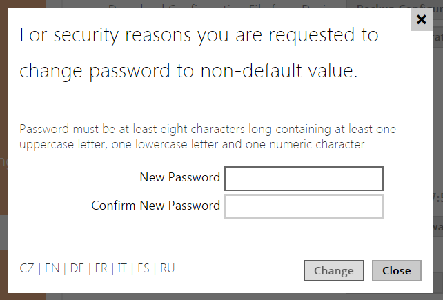 The intercom requires a password change upon the first login. Strong passwords are only accepted - eight characters at least including one capital letter, one small letter and one digit.