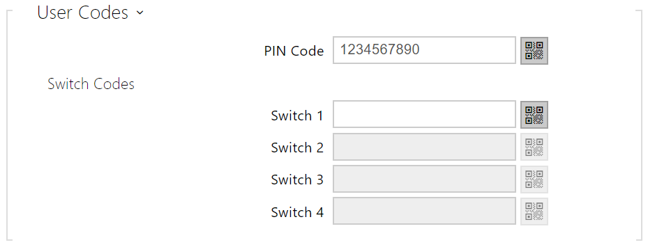 - Switch 1–4 – set a private user switch activation code: up to 16 characters including digits 0–9 only. The code must include 2 characters at least. The code must include at least two door unlocking characters via the intercom keypad and at least one door unlocking character via DTMF.