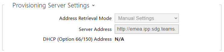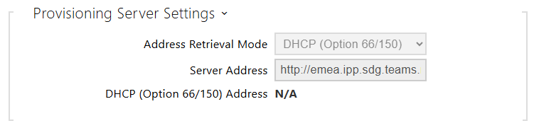 Address Retrieval Mode – select whether the MS Teams onboarding server address shall be entered manually or a value retrieved automatically from the DHCP server using Option 66/150 shall be used.