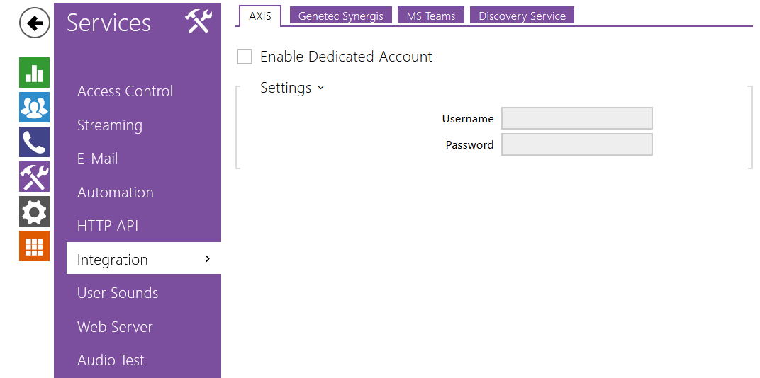 The administrator account can be used for AXIS integrations. You can use the dedicated secondary AXIS integration account if you do not want to share the administrator account with other parties or systems.