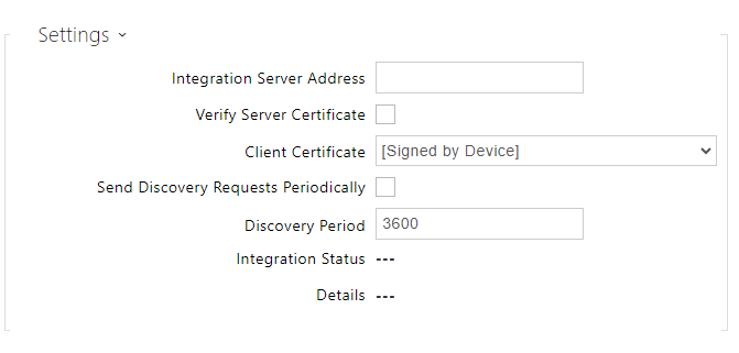 Integration Server Address – set the URL for the Discovery Service. The device sends HTTP requests with basic information upon its start, upon IP address change and periodically (if configured). If left empty, no requests are sent.