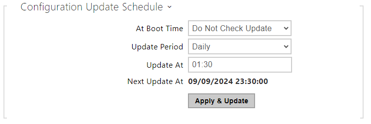 Update At – set the update time in the HH:MM format for periodical updating at a low-traffic time. The parameter is not applied if the update interval is shorter than 1 day. The time is set in UTC. Check value in Next Update At to see the actual time the update is scheduled for.